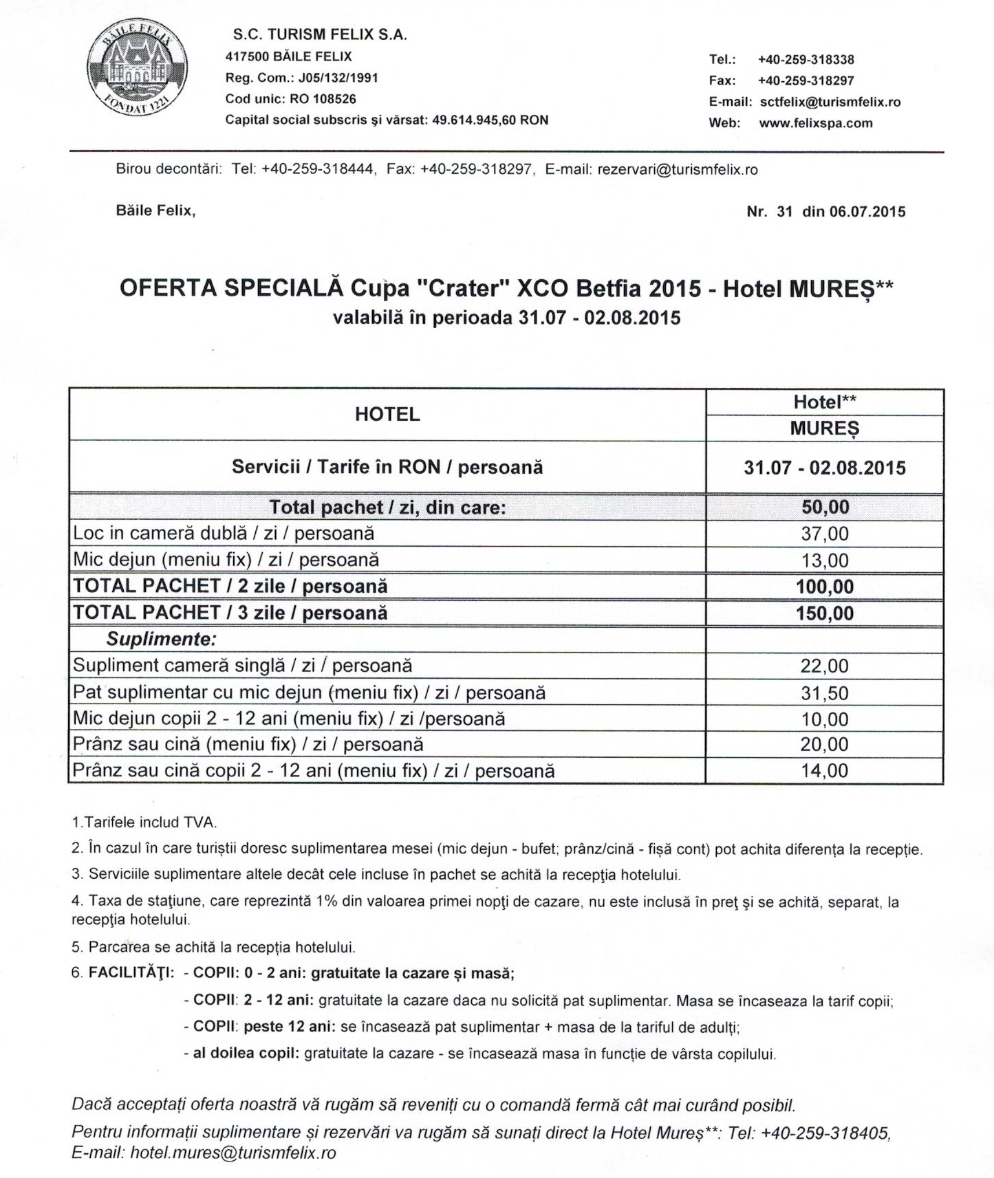 Gratie Sc Turism Felix Sa participantii la Crater XCO UCI C2 o sa aiba oferta de cazare cu mic dejun de nerefuzat la Hotel Mures din Baile Felix.