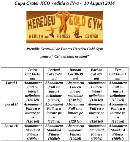 În cadrul Cupei Crater XCO 2014 o să premiem pe cei mai buni orădeni/orădence cu abonamente la Centrul de Fitness Heredeu Gold Gym (abonamentele având o valoare totală de 1750 Lei)!